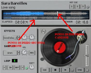 Dove, il punto di cue della canzone in alto è il punto di inizio Automix della traccia uscente mentre il punto di cue della canzone in basso è il punto di inizio Atomix della traccia entrante.