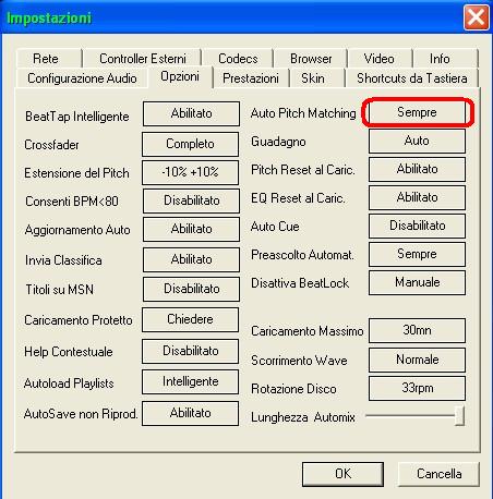 Per mettere a tempo due tracce o procedi manualmente modificando il pitch oppure puoi abilitare la funzione "Auto Pitch Matching" nel pannello OPZIONI.