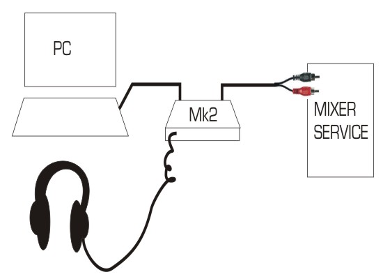 Colleghi la cuffia alla mk2 e all uscita 1/2 della mk2 ci colleghi un cavo RCA da dare a quelli del service. loro ataccheranno l\\\' altra estremita al loro mixer nel modo più idoneo alle atrezzature di cui dispongono. Ti alzeranno il volume del tuo canale quando serve e tu lavorerai o con il mouse o con la console.
