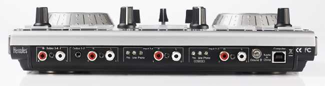 - 2 uscite stereo (2 x 2 RCA) consentono ai DJ di far ascoltare al pubblico i loro mix (canali 1-2: 2 uscite RCA per il collegamento di impianti hi-fi e mixer, oltre a un’uscita minijack stereo (1/8" / 3,5mm) per altoparlanti multimediali), mentre in cuffia è possibile ascoltare l’anteprima del brano successivo (canali 3-4: 2 uscite RCA, più una presa per le cuffie).
