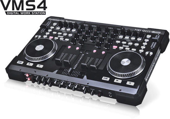 The VMS4 features American Audio’s signature “Velocity” touch-sensitive jog wheels, a full-function mouse pad, Midi assignable touch strips and high-quality channel and crossfaders.