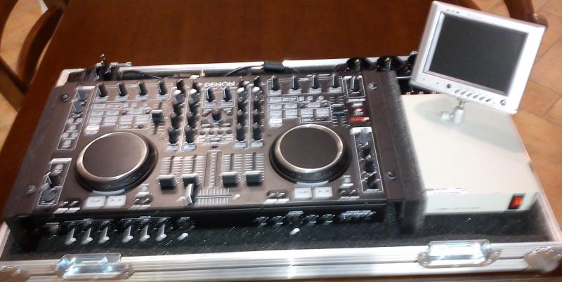 Ho adattato il case che avevo acquistao per DDJ-T1 inserendo una predisposizione rack per fissare la consolle e ho utilizzato lo spazio rimanente per inserire un distributore video sul quale ho fissato uno snodo con un monitor da 5 pollici, che una volta abbattuto rimane chiuso all\'interno della fly, la foto è venuta male, ma per essere un adattamento penso che sia venuto un buon lavoretto :-)