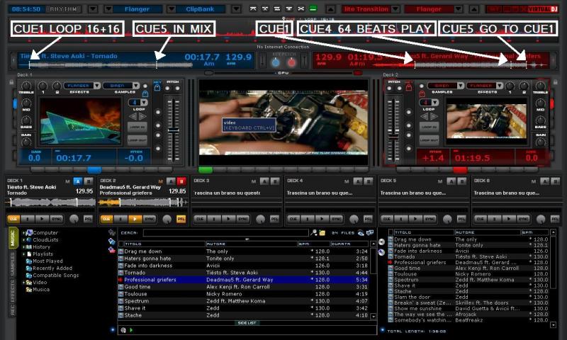 Mi sembra di fare un discorso da musicista SOUL o JAZZ,ma il tempo non lo conti a mente pensando "7,8,9,10,11,ecc...",ma lo senti ad istinto! Prima di provare a mixare,ascolta molta musica senza mixare nulla e cerca di apprendere la struttura! Lo sentirai ad orecchio la suddivisione delle 32 battute! A titolo personale ti posso dire che istintivamente mi torna facilissimo sentire i 4 segmenti da 8 beats che compongono il "famoso" segmento da 32 beats! Ascoltare e riascoltare ti aiuterà! Certo che la musica dance commerciale ti aiuterebbe a capire questa struttura perchè grazie alla parte cantata si nota si più! Ripeto che il masterbeat ha sempre un "tunz" più accentuato! Le musiche house e derivati,quindi anche la progressive,per un orecchio inesperto sembrano più ripetitive! "Allenati" ascoltando la dance tipo David Guetta (tanto per citarne uno!) e capirai sicuramente la struttura di una canzone! Quando avrai affinato la "sensibilità" dell'orecchio potrai cercare di "scorporare" la struttura delle canzoni che più ti piacciono! ...e grazie a questo conteggio imparerai anche a gestire al meglio i loop per far aver loro un aspetto armonioso per chi ascolta! La cosa simpatica di quando ti entrerà il conteggio nel sangue è che lo farai anche quando non serve! Magari ti ritroverai a tavola mentre mangi ad ascoltare...nelle ultime 8 battute inizierai a fare avanti e indietro con la testa come un piccione per tenere il tempo e picchietterai il dito sul tavolo come se dovessi premere PLAY al momento giusto! :-) ...il metodo che uso io non è per niente difficile,anzi,una volta appreso capirai la comodità! Per quanto riguarda gli HOTCUE,li setto con calma a casa mentre analizzo una canzone ed una volta impostati ti basta andare con il cursore del mouse sul punto HOTCUE sulla striscia sonora caricata sul deck,clickare col tasto desto "rinomina" e scrivere quello che più ti possa essere d'aiuto! Una volta salvati gli HOTCUE,quando arriverai a caricare il brano sul deck,in automatico sarà postato sul primo HOTCUE! Se la canzone dovesse iniziare dal secondo HOTCUE per poi saltare al primo,allora ti basterà premere il tasto del 2° HOTCUE e subito dopo PLAY per arrestalo e tornare indietro con la jogwheel fino al punto esatto di attacco del 2° HOTCUE e quando sarà il momento di far partire il mix basterà premere PLAY! ..e se non azzeccassi la battuta perfettamente,ti basterà correggere col pitch-bend!