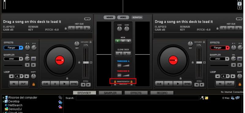 NUOVO PC: attivando lo scratch, ruotando velocemente la jog indietro con la traccia in play, il programma non scratcha ma invece fa band indietro ossia manda indietro la traccia a velocità più sostenuta ma senza l'effetto scratch tipico...