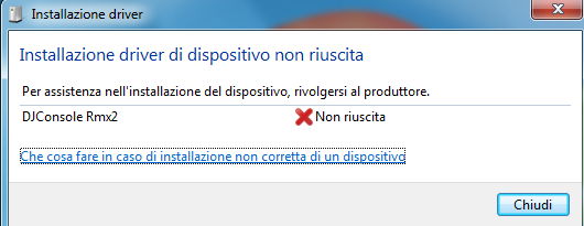 Ho acquistato qualche settimana fà la consolle RMX 2. Ho collegato tutto, solamente che quando collego la consolle al pc con la usb, mi appare la canonica scritta \"installazione dispositivo usb in corso...\" ma dopo mi dice \"Installazione non riuscita\" (con tanto di X rossa) infatti nella sezione configurazione di VirtualDj LE non mi appare niente!