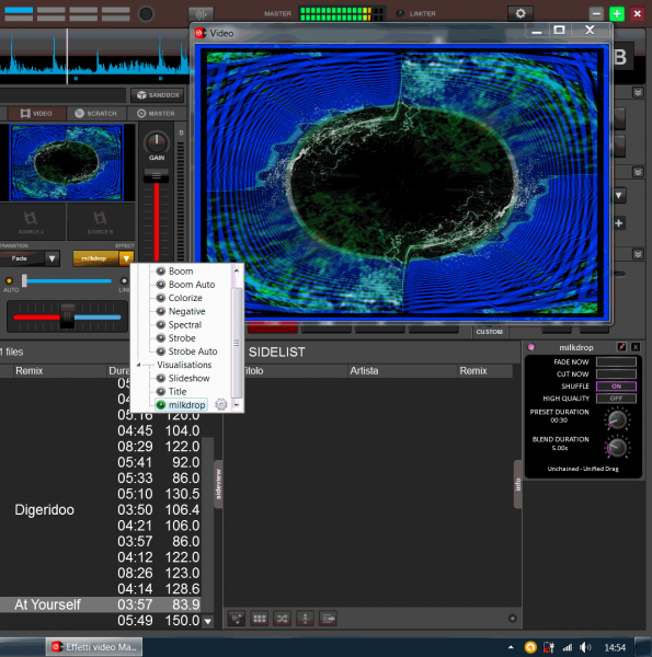 Ricordatevi che il file milkdrop.dll va spostato da Documenti\VirtualDJ\Plugins\VideoEffect a Documenti\VirtualDJ\Plugins\Visualisations per funzionare su VDJ 8, il topic di riferimenti lo trovate qui http://it.virtualdj.com/forums/187422/VirtualDJ_Plugins/Milkdrop.html