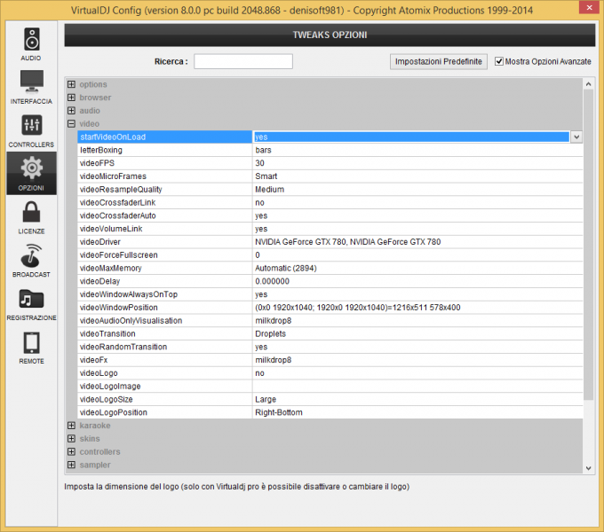 Vi allego anche uno screenshot delle relative opzioni video presenti sul mio config di virtual dj.