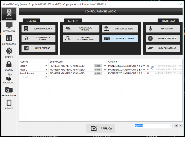 Nelle impostazioni di vdj, quando collego la Aero, non vedo la sua scheda audio mentre se ci collego la Wego3 mi appare correttamente.