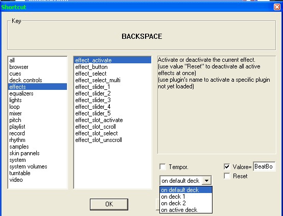 se vuoi utilizzare un tasto per attivare/disattivare un effetto specifico devi usare l'action effect_activate e nel campo valore specificare il nome dell'effetto che vuoi attivare/disattivare (es "flager" oppure "beatgrid")