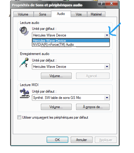dans le panneau de config--->son et périphériques ---> audio y a t\'il les deux carte son