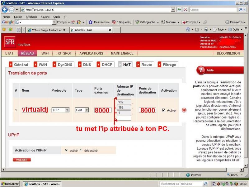 donc j'ai la neufbox 4 en parfeu j'ai zone alarme qui me sert d'antivirus également,et je possède virtual dj home édition 2006 d'ailleurs je viens de faire une mise à jour maintenant c'est virtual dj home édition 4 je crois enfin bref ca ne doit pas changer grand chose.....le problème je suis débutant dans le monde internet je sais même pas ce que c'est ouvrir un port ni ce qu'il faut taper!!je vais entrer dans d'autres précision.....j'ouvre virtual dj je clique sur rec puis sur broadcast.je me suis mis en master ,shoutcast mp3 puis sur broadcoast from my own computer puis sur ok et sur start recording.