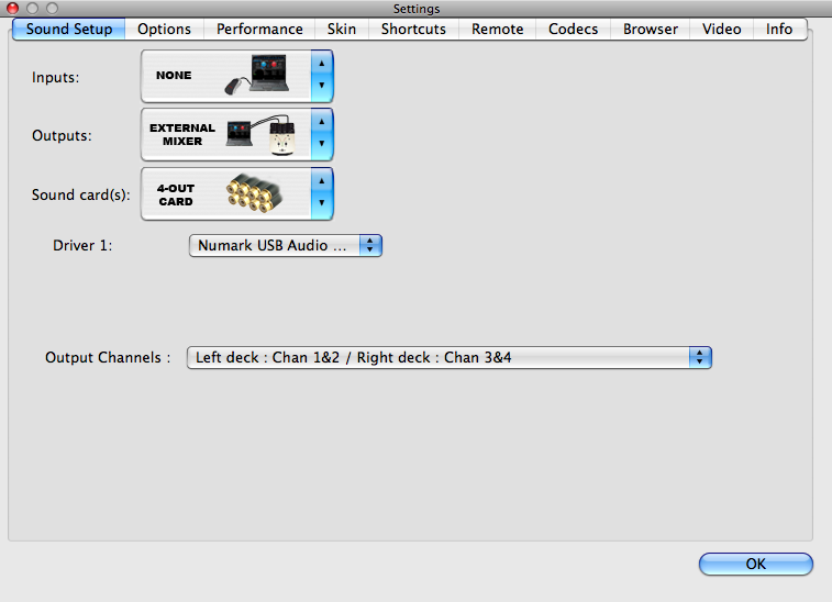 Just installed the DJ IO software on my Macbook pro, it works good and sounds pretty good. The only thing I havent figured out yet is how to split the decks onto 2 channels. When I was using the DJ IO with my PC I used the right Deck on Channels 1 & 2 on the IO and left deck on channel 3 & 4. This way I was able to cue up my next song and do the mixing on my external mixer, is there anyway to do that with the mac?