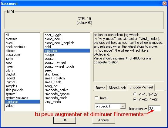 Dans l'onglet Encorder/Wheel tu sélectionnés +1=65, -1=63