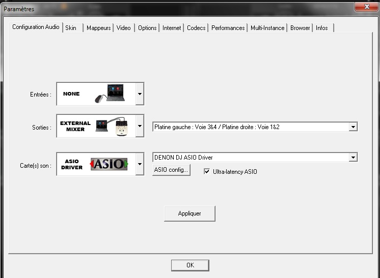 - Pilotes ASIO DENON 1.01. Les 2 platines son cochées.