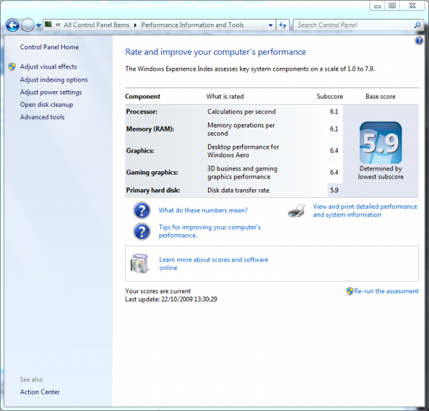 The lowest score in the Experience Index was for my HDD. Unless you have a solid state drive you will not get above 5.9 - (i have a 500gb 7200rpm drive in my Macbook)
