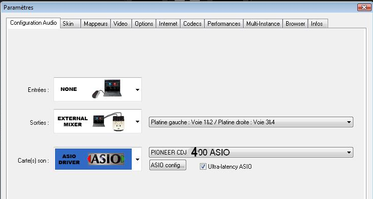 Pour faire fonctionner les CDJ 400 avec VDJ, il faut mettre en entrée : none; sortie : external mixer; carte son : soit 2 cards (CDJ 400) ou asio.