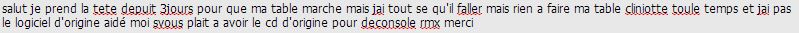 salut je prend la tete depuit 3jours pour que ma table marche mais jai tout se qu'il faller mais rien a faire ma table cliniotte toule temps et jai pas le logiciel d'origine aidé moi svous plait a avoir le cd d'origine pour deconsole rmx merci