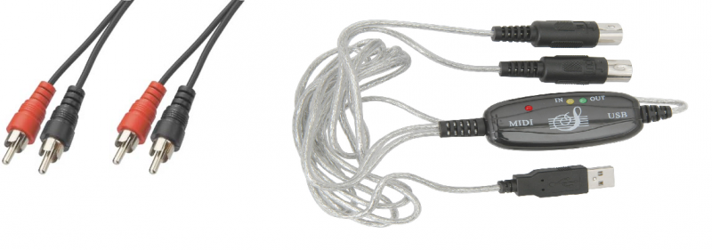 En résumé, une carte son en usb sur l'ordi (livré avec son câble usb), un câble usb midi en usb sur l'ordi, un câble rca pour les enceintes, 2 câbles rca pour brancher la carte son sur la ddm