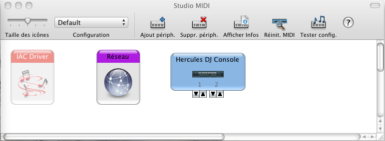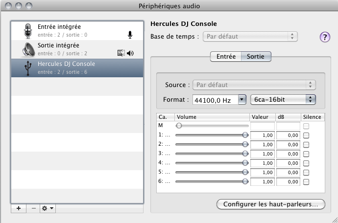 Sous Application > Utilitaires > Configuration audio/MIDI, la DJ Console devrait apparaitre comme ceci sous Snow Leopard (10.6.4 étant la plus récente version):