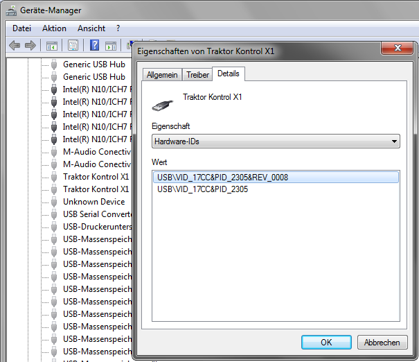VID und PID sind bei beiden Traktor Kontrol X1 Einträgen im Gerätemanager gleich.