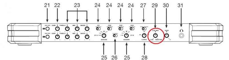 Hier wird die Kopfhörer‐Ausgabe von CUE auf MASTER geblendet. Steht der Regler auf CUE, empfangen die Kopfhörer das Signal von allen