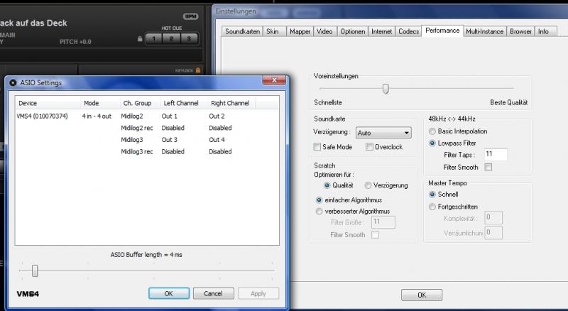 mit dem knistern, das hatte ich auch. hab den asio puffer auf 4ms bei aa asio config und in config / virtual dj auf auto. mir ist aufgefallen das die werte nur dann übernommen werden (grafisch zwar richtig aber bei der console nicht) wenn die console abgeschaltet und vom usb stecker getrennt wurde.