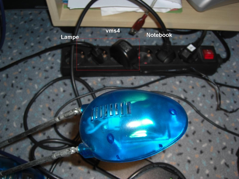 Zuerst VMS4 nochmal an Desktop-PC angeschlossen, sie steht da wo sie immer steht, Lampe dahinter. Läuft gut, Lampe An/Aus: Kein Problem.