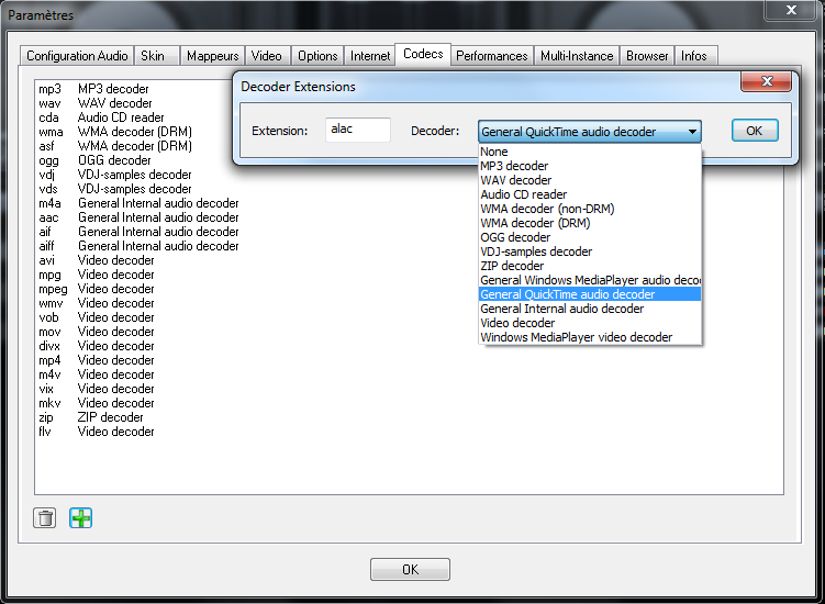 un clic sur la croix verte (ajouté) la fenêtre s'ouvre, déroule le menu décoder et selectionne "général Quicktime audio decoder", tape "alac" dans extension et fais un essai.
