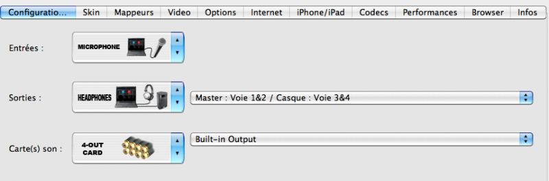 voici la config que j'utilise dans virtual dj dans l'onglet configuration SAUF, qu'à l'emplacement carte son, c'est la 4MX et non pas le built-in-output, je n'avais pas connecté la 4MX lors de la prise d'écran...