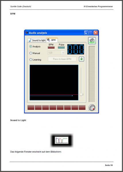- Sound to Light habe ich nie hinbekommen, vielleicht liegts an der Software. Für mich aber kein Problem, meine Par's haben selbst Sound to Light, also einfach dort per makro eingeschaltet, ab und zu mal mit den Farben gespielt, Strobe eingeschaltet etc.
