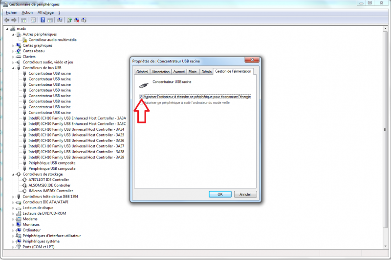 ensuite dans panneau de config----->gestionnaire de pérripherique->controleurs des usb->clic droit sur concentrateur USB racine->gestion d'alimentation et décoche "autorise l'ordinateur a éteindre pour économisé l'énergie" est le faire sur tous les port usb...