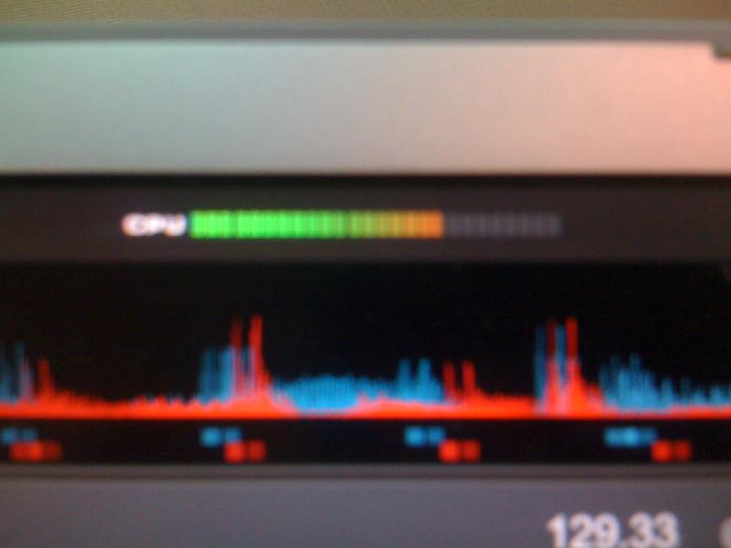 Before removing the battery, the meter was 70% (picture attached - sorry blurry, but you get the idea). But after I removed my battery, the CPU meter jumped to 100% and stayed there. I too experience audio dropout when the CPU goes to like 80%+ (which happens alot) for this Mac/VDJ. I have noticed some skins cause higher CPU usage than others.