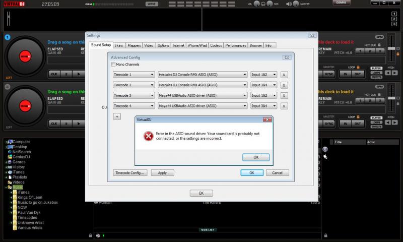 i am trying to use VDJ 7 using the 4 deck skin and controlling each deck with a seperate timecode, using 2 soundcards 1=maya 44 USB and the other =hercules RMX, i am trying to set it up via the advanced config option but keep getting an error message, i have tested each sound card on its own and they are working fine.