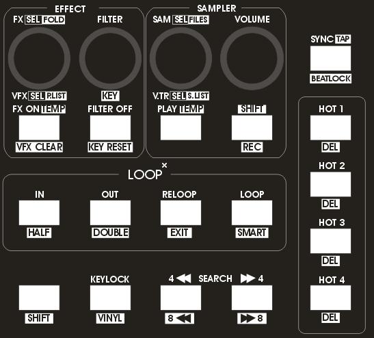 9 BUTTONS on each side of the VMS4 are dual lighted (HOT CUES 1..4, SYNC, Loop in, Loop ou, Rellop, Loop)