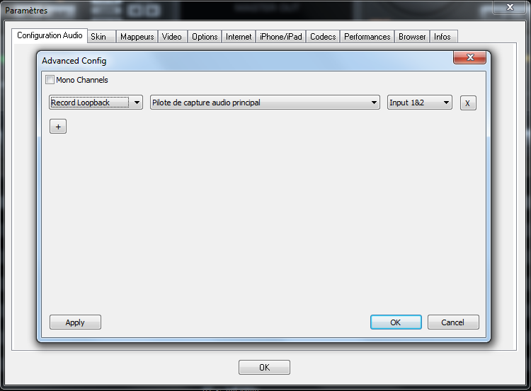 Dans l'onglet AUDIO SORTIE il faut mettre : ADVANCED CONFIG