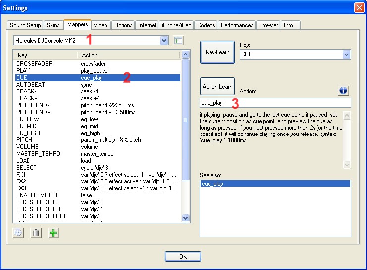 Pour votre problème de touche, la réponse est "hot_cue". Si vous voulez que votre CUE ce syncro