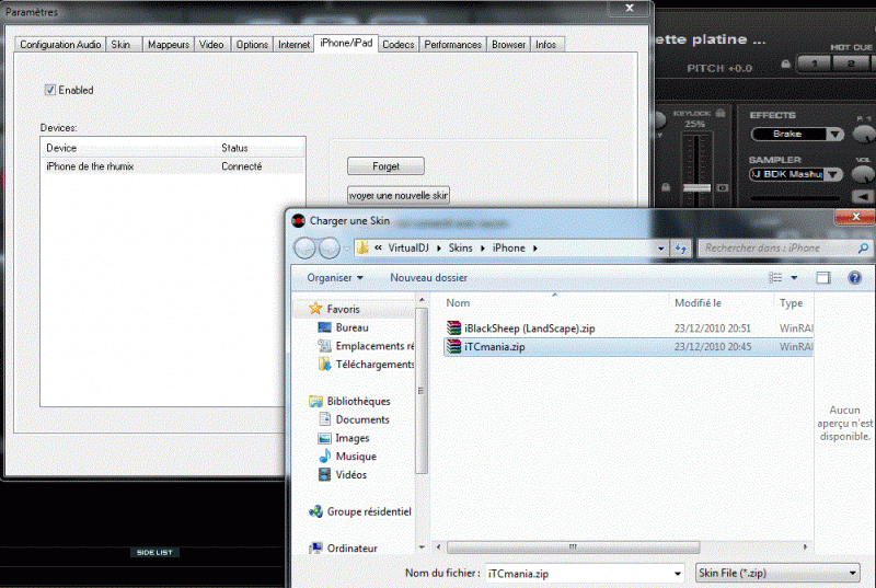dans vdj il suffit juste de cliquer dans l'onglet Ipd/iphone, et sur "envoyer un skin"