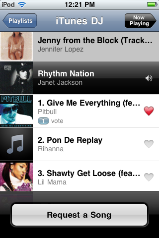 1. This pic shows the playlist. You can scroll down to see the next 15 songs in the current playlist. You can also see the current playing song and the last song played. It also shows how easy it is to Request (add) a song to the playlist.
