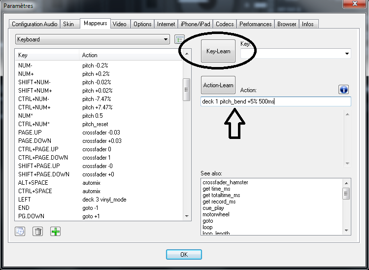 ensuite dans la case en dessous action-learn tu tape deck 1 pitch_bend +5% 500ms (comme sur l'imprime ecran) et tu clic ok