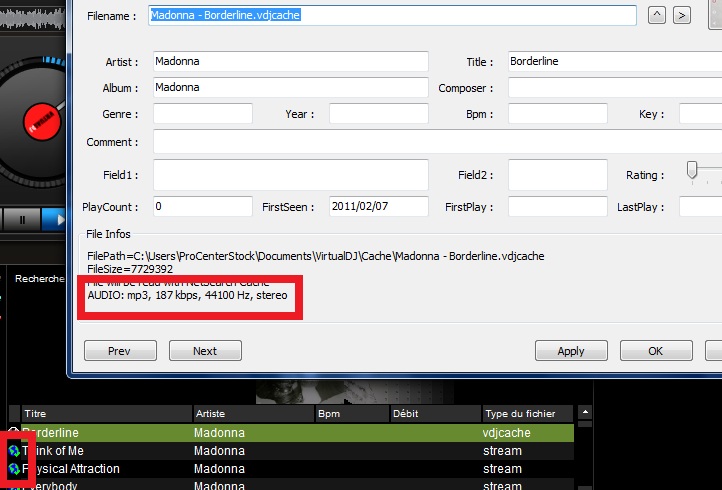 Il faut choisir les fichiers qui ont un petit "V" de couleur verte comme sur mon image, la tu es sur à 99% d'avoir un MP3 de qualité et si tu veux contrôler le débit alors il faut que tu le télécharge avec un CLIC DROITE sur le fichier et faire CHARGER EN CACHE et une fois ceci fait tu re clic sur le fichier avec le bouton DROITE et la tu as accès aux informations du fichiers !