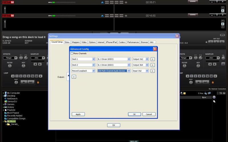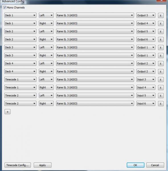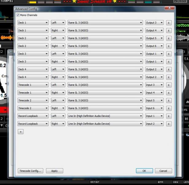 OK I have figured out most things when it comes to the advanced config but the 1 thing that I still cant get to work is recording with an Ext. Mixer..................The only way I can do it is to have my crossfader mapped (using an Ecler NUO4) but then I loose 2 channels. They can either be midi or anolog but not both. My soundcard is the SL3 setup for 4 decks, heres a screen shot,