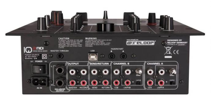 With the IQ2 MIDI Reloop presents the latest mixer from the trend-setting IQ series. Compared to its predecessors the IQ2 MIDI is completely digital with the best, noise-free sound characteristics and a 4x4 multichannel USB audio interface with 24 bit / 96 kHz studio quality. As all elements are MIDI compatible this mixer can also be used as MIDI controller and thanks to the MIDI flex function, the crossfader, as well as the effect unit, can be used in MIDI or audio mode. Moreover the IQ2 MIDI offers a digital matrix-input function. This way all audio inputs, as well as all MIDI channels, can be flexibly routed to the channels. The ASIO/CORE audio drivers guarantee the absolutely lowest latency for a professional standard while mixing. Further novelties are the reversible crossfader and the 2 battle mode that allows looping in a second mixer or DVS system via the loop input. Topping it all off is the fact that the mixer is (Other Software Ready) and it can be selected very easily within the software as preset. No matter if digital DJ, turntablist or electro clubber this mixing talent does not leave anything to wish for.