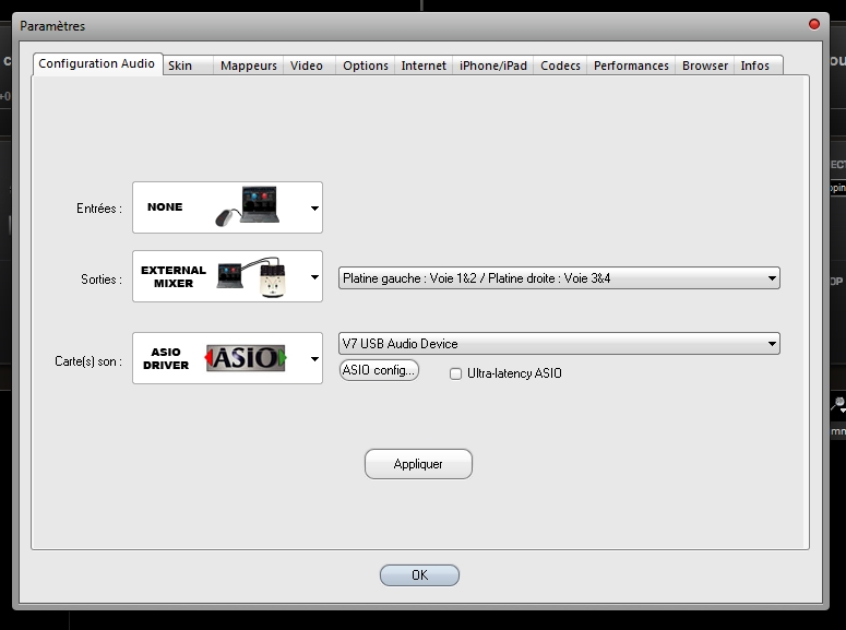 puis soit redémarrer les V7 et VDJ ou juste cliquer sur appliquer dans le menu config audio.