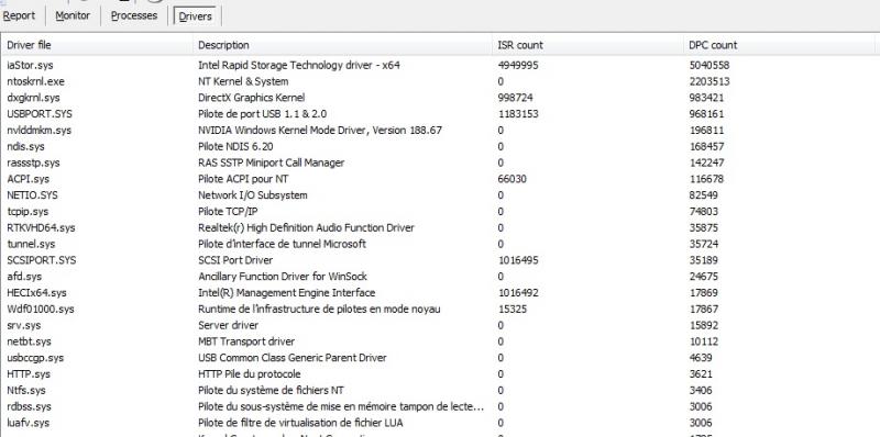 Si un souci est détecté le plus simple et de vous rendre sur l'onglet Drivers et de cliquer sur DPC count (voir image) cela va vous donnez en 1er les pilotes qui consomment le plus de ressources et voir lequel vous fait des siennes.