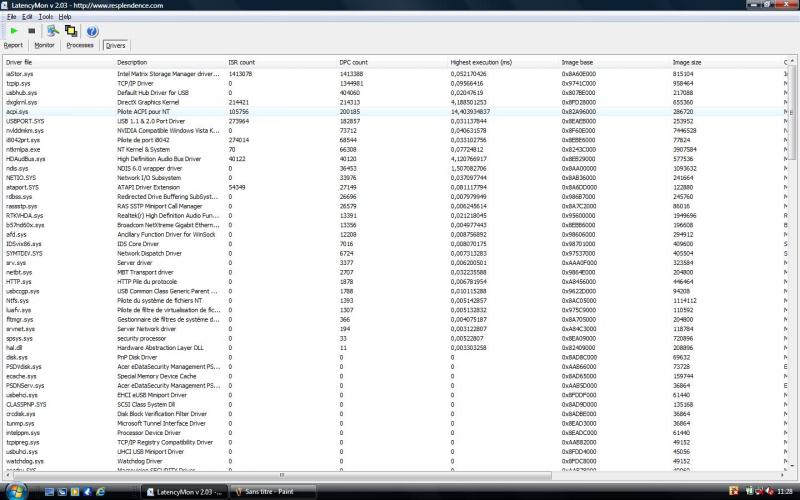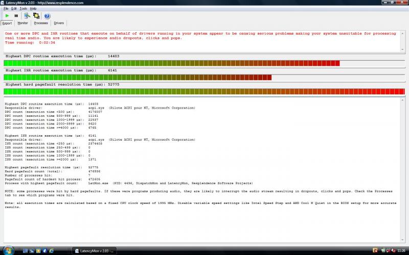 LatencyMon désigne le driver acpi.sys comme responsable pour le DPC (highest execution 14.4ms!!!) et pour l' ISR pareil (highest execution 6 ms). J'ai bien désactivé batterie compatible ACPI dans le gestionnaire des périphériques et veillé à ce que le pc n autorise pas à éteindre le périphérique pour économiser de l'énergie mais très peu d'améliorations...