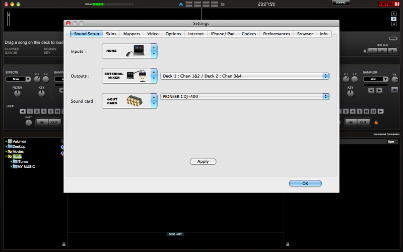 The third way is mainly if you need to assign specific stereo pairs to multiple cards with multiple channels. As an example, I have a MOTU Ultralight as my main audio but also use a Logitech USB sound card and a DeeJay Trim 4x6. The ultralight has mixing capabilities and uses 1&2 for mains. I also need to output the four decks individually, which is 3&4/5&6/7&8/9&10 on the MOTU. I then need to send the effects out but don't have any more analog on the MOTU so I need to go out either the Logitech or Trim. This requires you to choose Advanced Configuration for the output, which will allow specific mapping of each card and each pair for specific outputs and inputs.