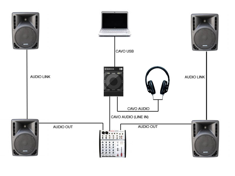 e questa per l\'utilizzo professionale utilizzando una scheda audio esterna per il DiJ, un mixer live e due coppie di casse amplificate: