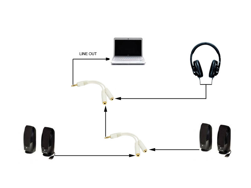 Se usi il pc a casa per un uso personale, puoi gestire il tutto con dei semplici sdoppiatori di segnale che prendono il segnale stereo della tua scheda audio e lo sdoppiano in due segnali mono: 1 per la cuffia e l'altro per le casse esterne: