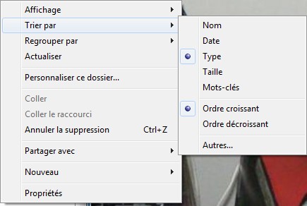 Tu fais un clic droit sur le fond blanc de la fenêtre qui contient tes images --> Trier par -> type et Ordre croissant