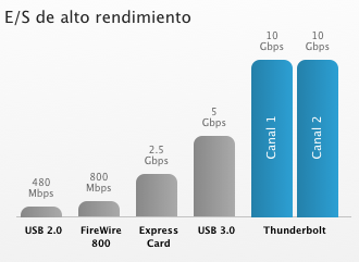 Thunderbolt está pensado para extender el gráfico a este puerto como una opción e igualmente ofrecer un enlace con medios de almacenamiento a una velocidad superior. Como quiera la velocidad de los discos duros marca la velocidad de transferencia.